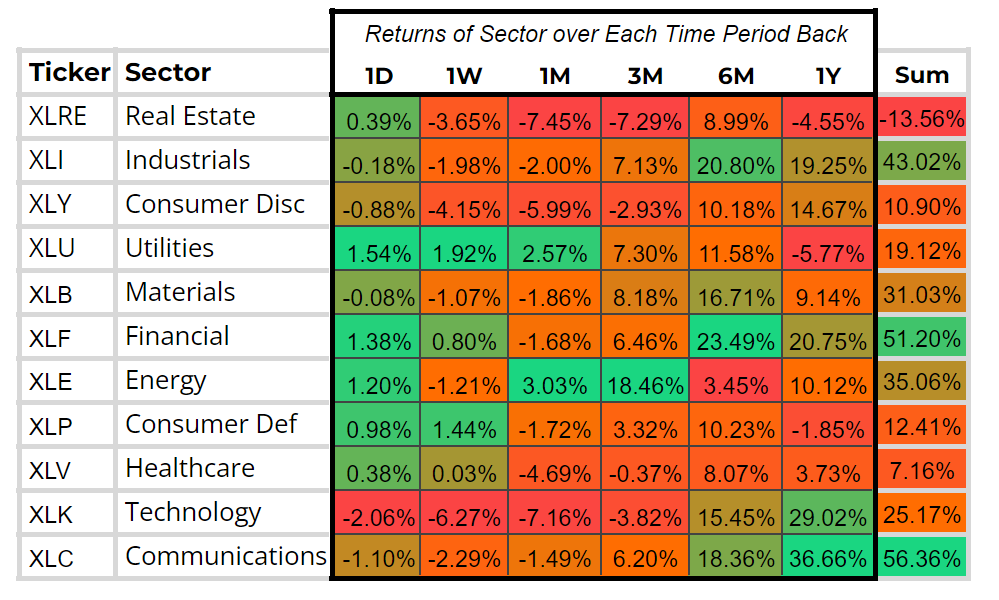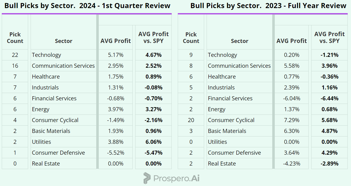 More importantly we opened ourselves up to new Sectors as Tech has started to show issues. After 2 picks between Utilities and Energy with underwhelming returns in all of 2023 we are already at 8 through Q1, not only that but it represents 2/3 of our best Sectors!