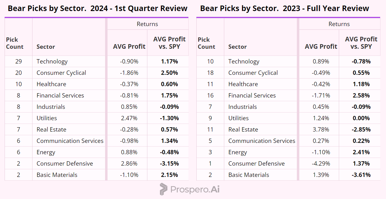 There is a continuation of the shift we talked about on the Bull side. Not only did we move away from Consumer Cyclical longs in 2024, we turned it into a short target based on our Macro view. This really underscores how valuable having a Macro view and signals like QQQ and SPY Net Options Sentiment to support it can be. We do have some consistency with our Financial Services shorts. We are proud that not only have we done well on longs in tech, but we also did well on shorts too. This shows how powerful our signals are that we can push out such a large quantity of Tech longs and shorts and win on both sides! (Especially after being in the red on Tech last year.)