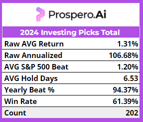 The investing newsletter picks beat the S&P 500 by around 50% in 2022 and 2023, and are strong again in 2024. Beating by 94% so far this year (on an annualized basis). Our win rates continue to be impressive and consistent. 61% this year, 60% last year and in our Model Trading Portfolio that engages in a high frequency trading strategy, is at 59% on almost 1,200 investments since inception (6/4/23).