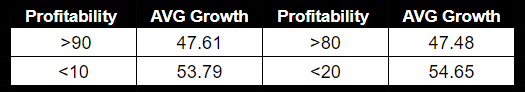 Then he looked at all the companies with a profitability rating of less than 10. Their average growth score was only slightly higher at 53.79.