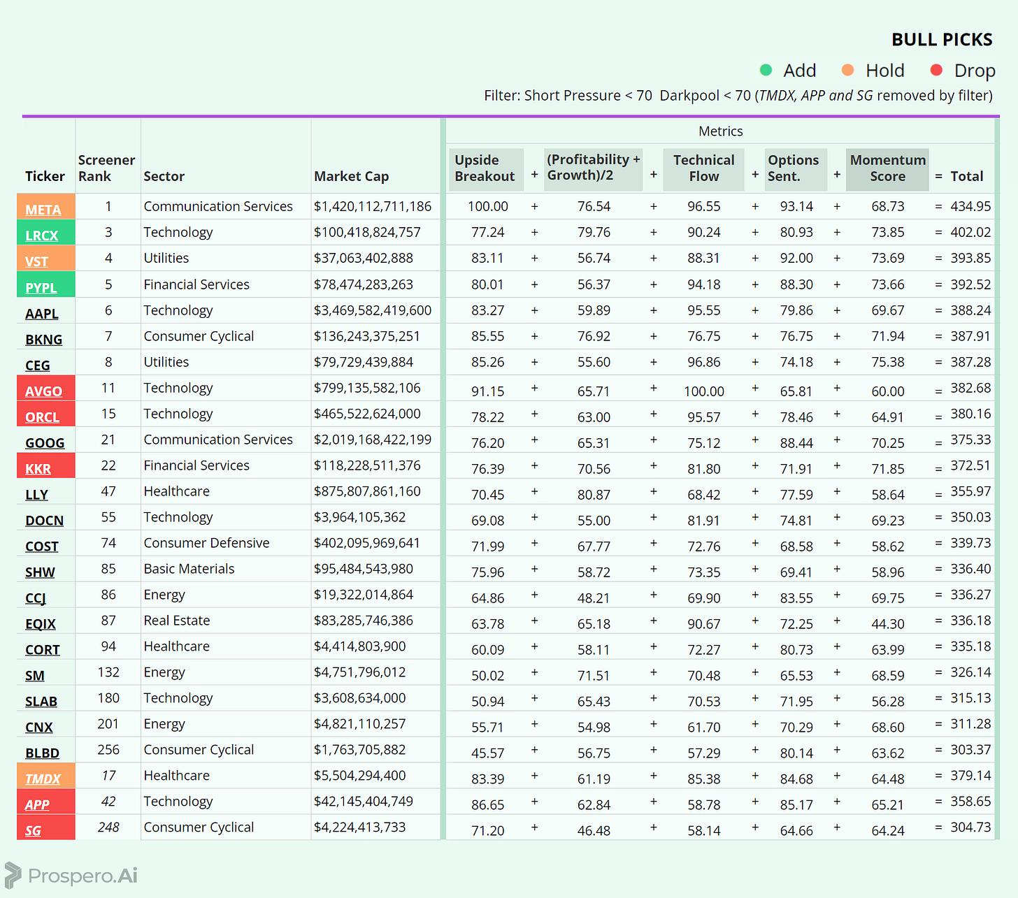 Long / Bull Moves - LRCX and PYPL adds / META, VRT and TMDX holds / AVGO, ORCL, KKR, APP and SG drops