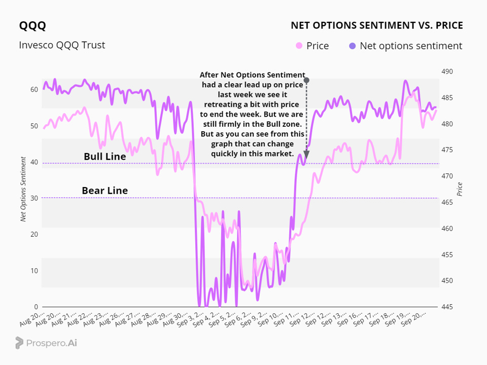 Check out the QQQ Net Options Sentiment chart below. We saw QQQ numbers jump and have a clear lead up before the move in price last week, but then surrendered a bit to finish out Friday. The good news is that our numbers are still firmly in the Bull Zone. As you can see from simply looking at the Net Options Line in dark purple, things can change quickly in this volatile market environment. As we approach October of an election year, it's important that we remain vigilant to watch for a shift in numbers