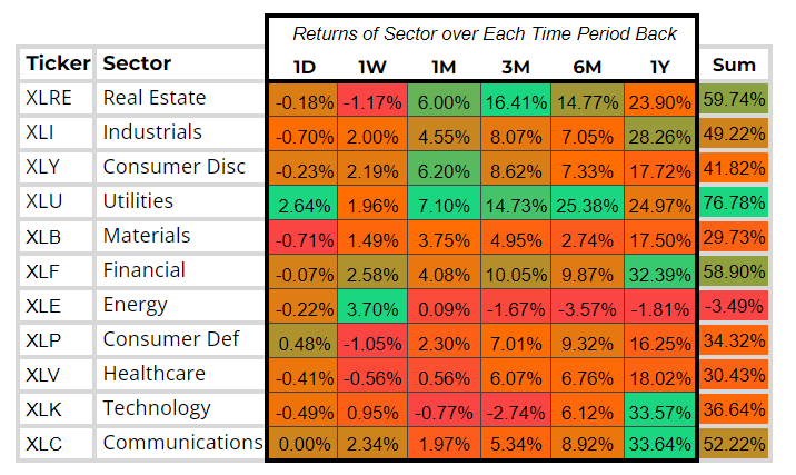 Check out the Sector Analysis Table above. One sector that leaps off the page is Energy. The bottom in Energy is likely in, and could potentially be an area of strength in the coming weeks. That, of course, can change quickly depending on the outcome of the election. Utilities continue to show relative strength, which further proves that people are NOT risk–on in this current volatile environment. Healthcare and Consumer Defensive and Real Estate (sell the news after rate cut) showed the greatest weakness last week.