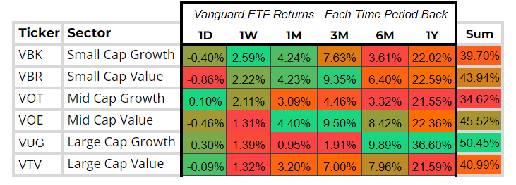 Small Caps growth and value had a strong month. But so did Mid Cap Value, which grew more than any other Cap. This is a good sign for the expansion of market breadth and strength. Large Caps were in the positive for the week, but didn't see the rebound of Small and Mid Caps. It will be interesting to see if that trend continues over the next couple of weeks.