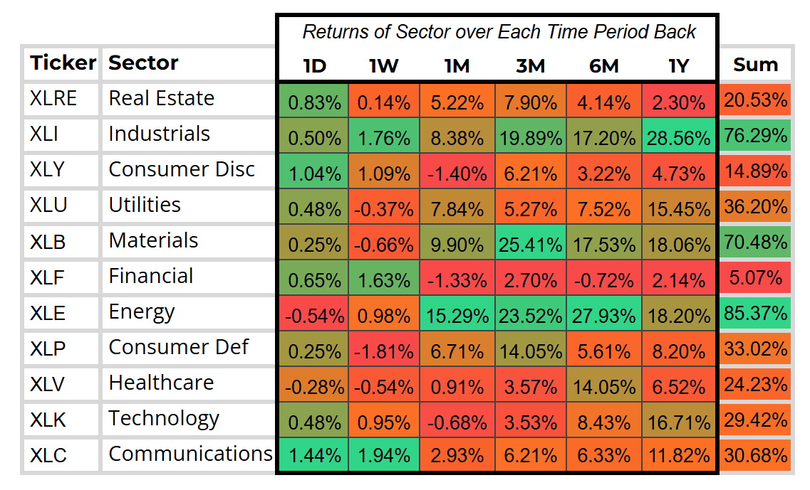Communication Services rebounding after being broadly oversold, could be a great entry point for longer term minded investors depending on the stock. Industrials continuing its strong run right now as the AI trade really broadens out similar to the last couple of weeks, as investor focus shifts from tech to metal and physical. Consumer Defensive still the bulwark of decent returns but also retracing a bit since the trade became a bit crowded especially in the larger names.