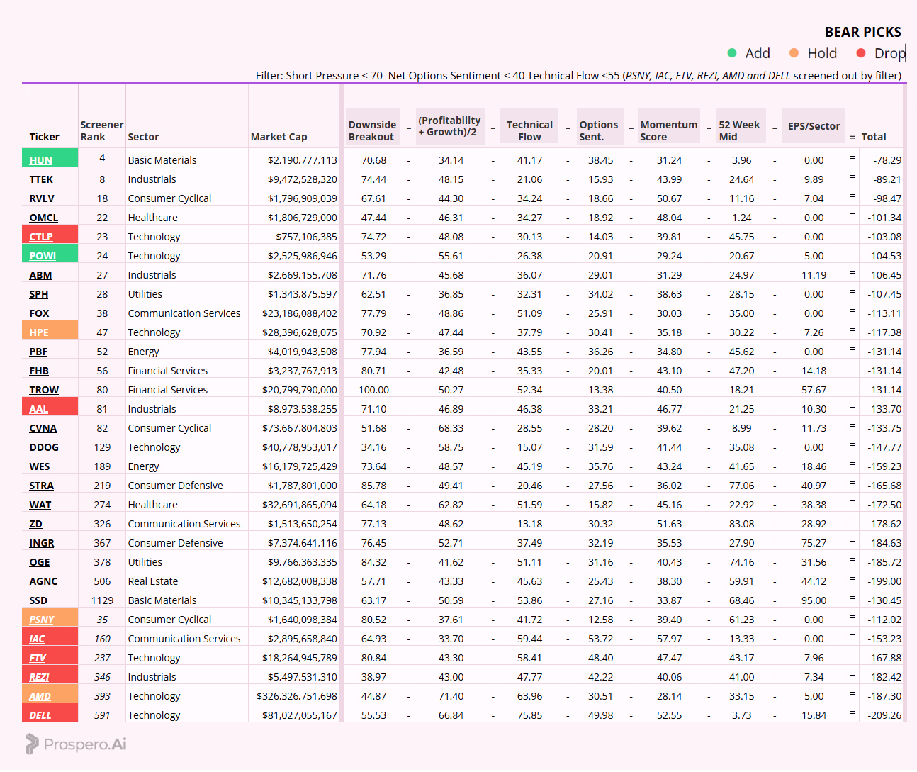HUN was an easy add at the top of our screener with Basic Materials pulling back a bit good to add a short position. POWI was added for Tech exposure with favorable Momentum and Net Options.