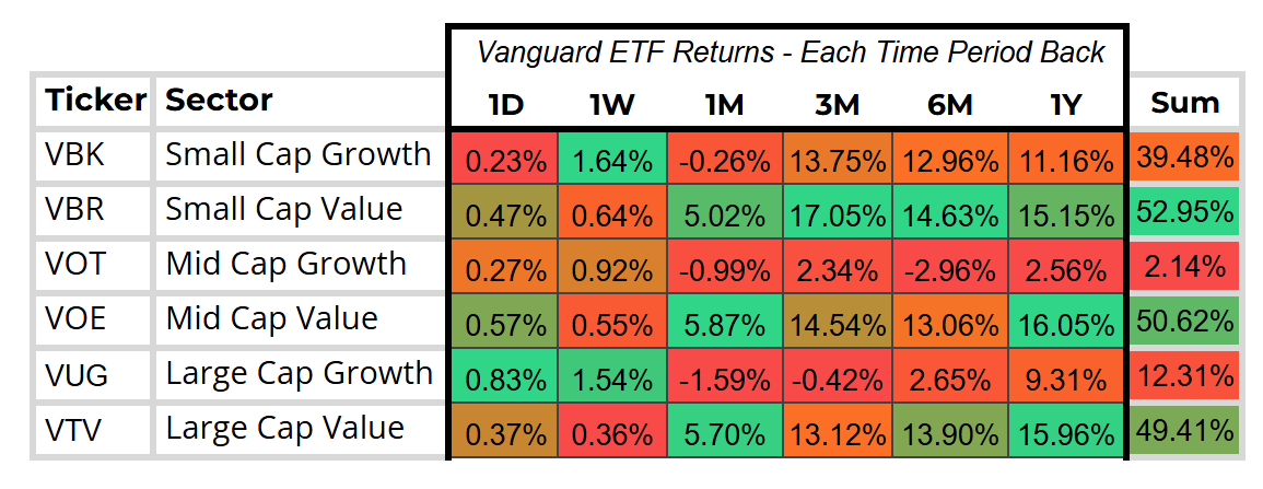 Small Cap and Large Cap Growth with quite the resurgence here this week, seems like they were broadly oversold the last couple of weeks, especially in the large cap space where institutional ownership reached recent lows. Value still performing well over the last month, but we’ll see if there’s any significant reversal trade to growth next week.