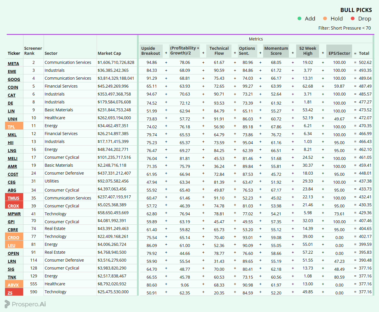 TPL a good keep with the way Energy has been performing as of late, with great Net Options and decent Momentum. CRDO was kept because of its Net Options. LEU was kept as well for Energy exposure and Net Options. Finally, we liked mid cap ABVX with good Upside Breakout and Net Options.