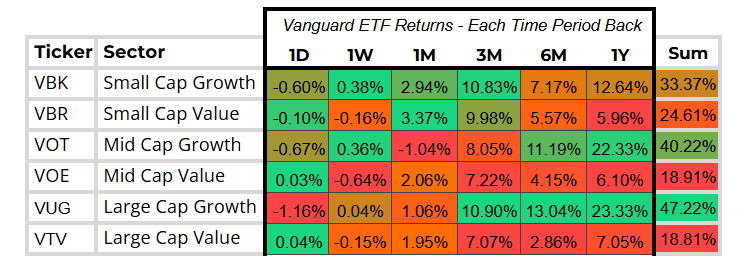 A pretty flat week overall for everyone. Small and Mid-Cap growth faired slightly better than the rest but not by much. As we’ve noted in previous letters, there seems to be a broadening out into small caps in particular over the last series of months, and we’ll be picking up smaller cap names to ride that wave.