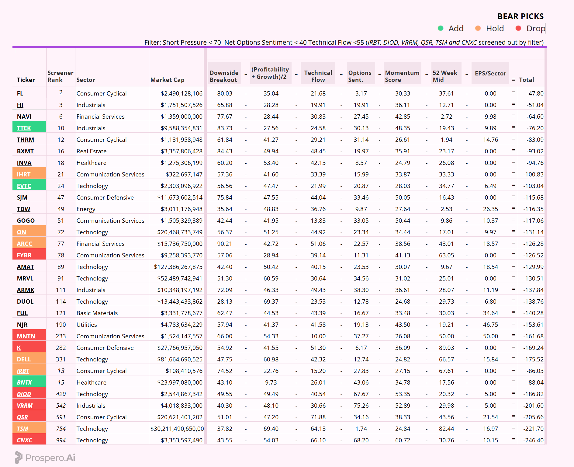 Short / Bear Moves – TTEK, BNTX and EVTC adds / IHRT, ON, ARCC, DELL, IRBT and TSM holds / FYBR, MNTN, DIOD, VRRM, QSR and CNXC drops