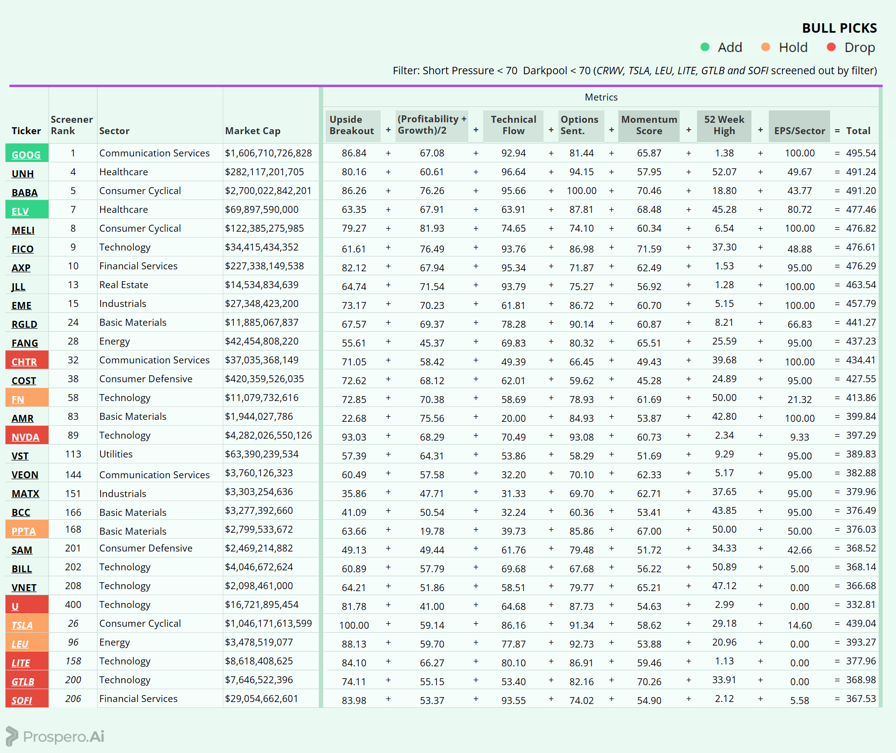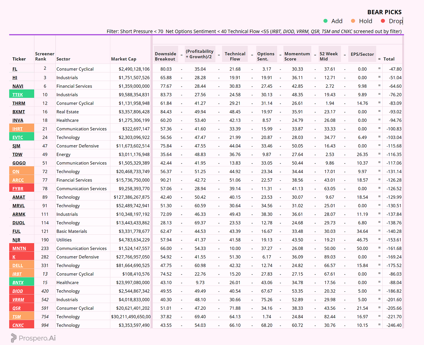 TTEK was added for larger cap exposure with decent Downside Breakout. EVTC was added for Tech exposure with poor earnings power. BNTX was added as a counter-balance to ELV with great scores for a large cap.