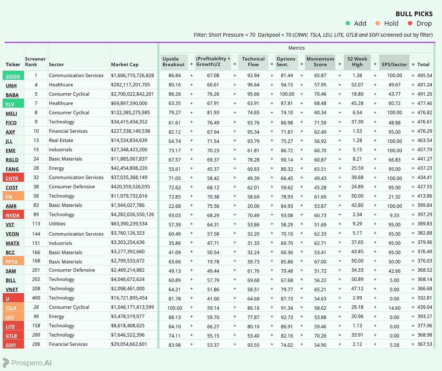 CHTR was dropped because it didn’t have any standout metrics. U and NVDA were dropped because we wanted to reduce our Tech exposure. LITE, GTLB and SOFI were all dropped as they were screened out.