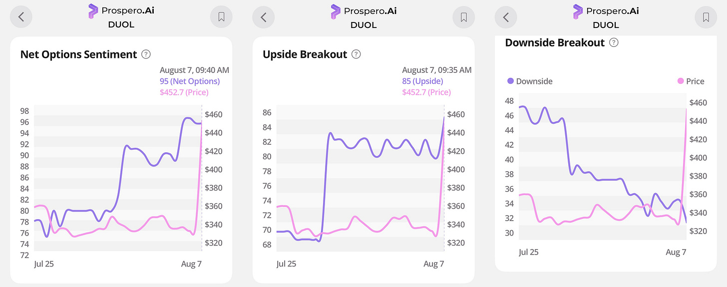 Duolingo showed how much the Prospero signals can tell us about breakout stocks. Even without reading the earnings data, the upside was crystal clear from our signals.